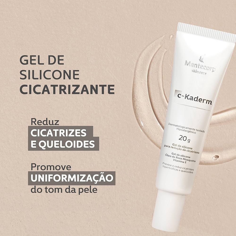 O C-Kaderm é um gel cicatrizante formulado com óleo de rosa mosqueta e vitamina E, ideal para prevenir e reduzir cicatrizes hipertróficas e queloides.